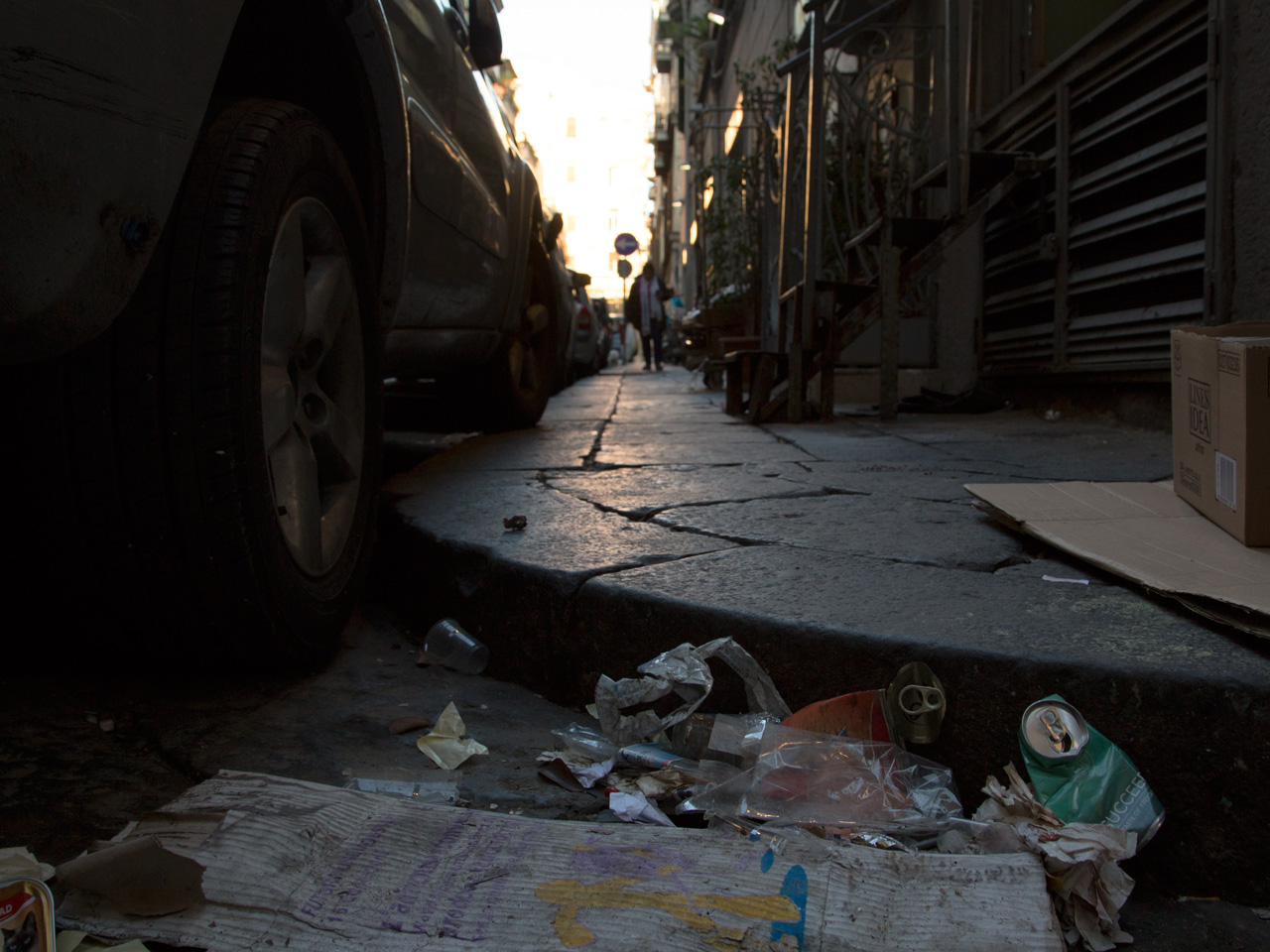 Der Müll wird von der Abenddämmerung gnädig umhüllt. Eine stilsicher arrangierte, tragische Momentaufnahme der europäischen Wegwerfgesellschaft. Dabei ist es doch schade, einen so hübschen Drink einfach wegzuwerfen.